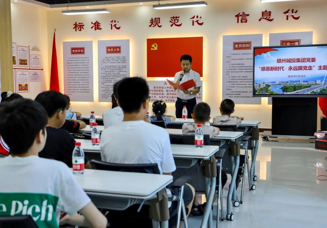 在集團黨性教育體驗室,由集團機關一支部的黨員代表為孩子們精心準備了紅色傳承系列活動,黨員們深情朗誦了方志敏的《可愛的中國》,講述了紅色故事《八子參軍》,合唱了《沒有共產黨就沒有新中國》,并陪伴孩子們一起觀看了紅色影片《建黨偉業(yè)》,進一步增進孩子們對黨的歷史的了解,深切體會當今美好生活的來之不易。臨別時,贛州城投集團團委也給孩子們分別贈送了小禮物。