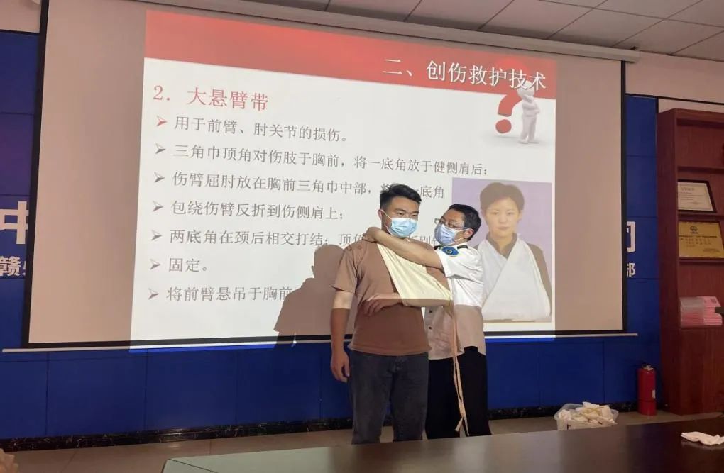 在應(yīng)急救護(hù)知識培訓(xùn)階段,贛州市急救中心醫(yī)務(wù)人員對應(yīng)急救護(hù)知識進(jìn)行現(xiàn)場授課,重點對止血包扎、海姆立克急救法進(jìn)行實操演練,大家現(xiàn)場學(xué)習(xí)了如何利用生活中隨處可見的物品對較小創(chuàng)傷進(jìn)行自救的方法。