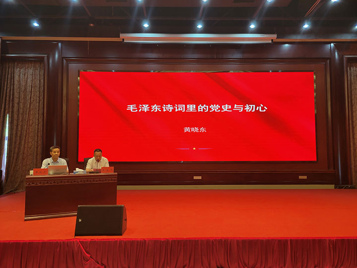 黃曉東同志以《毛澤東詩詞里的黨史與初心》為主題,以毛澤東同志的革命道路為主線,品讀毛澤東同志不同時期的詩詞,從離愁別恨里的黨史與初心等10個方面,回溯偉人立志報國救亡、書生意氣的青年時代、艱苦卓絕的革命崢嶸歲月、如火如荼的社會主義革命和建設歷程,彰顯偉人獨具魅力的個性情懷和豪邁氣概,闡述了共產(chǎn)黨人的初心與使命。