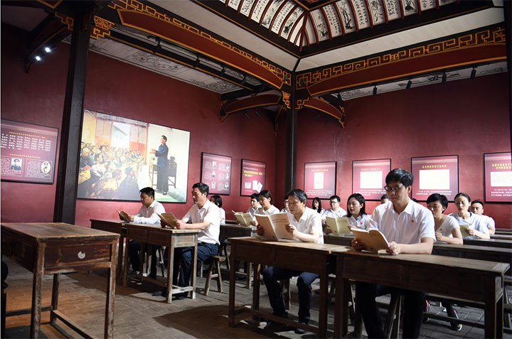 在興國縣蘇維埃政府所在地——瀲江書院,毛主席在這里舉辦了興國縣土地革命干部訓(xùn)練班,為中央蘇區(qū)的土地革命培養(yǎng)了第一批斗爭骨干,建立了興國縣第一個(gè)革命政權(quán)。大家在土地革命干部訓(xùn)練班舊址學(xué)堂內(nèi),集體誦讀了一段土地革命時(shí)期的歷史,當(dāng)朗朗書聲再次在書院響起,珍貴的革命記憶浮于腦海,激勵(lì)黨員們延續(xù)紅色根脈、傳承紅色基因。