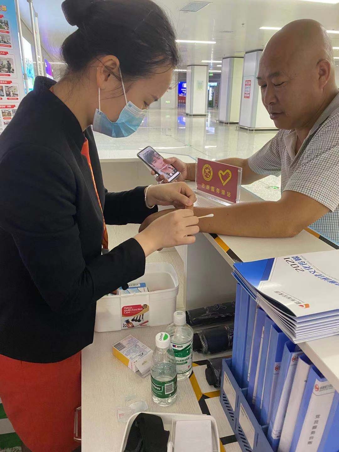 6月6日,一位男士來(lái)到贛州西站黨員服務(wù)窗口詢問是否有創(chuàng)可貼,經(jīng)了解,該旅客手部因不慎刮傷流血不止,值班人員察看傷口后,迅速先幫旅客采取酒精消毒,再熟練地用創(chuàng)可貼包扎好傷口。該男士連聲道謝,露出了滿意的笑容。