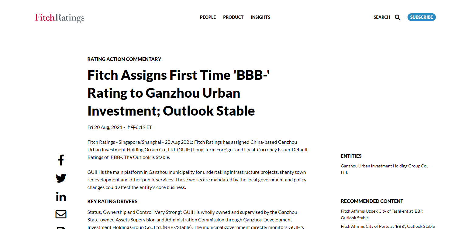 日前,經(jīng)國際權(quán)威信用評級機(jī)構(gòu)之一——惠譽(yù)國際信用評級公司評定:贛州城投集團(tuán)首次國際信用評級為BBB-,信用評級展望