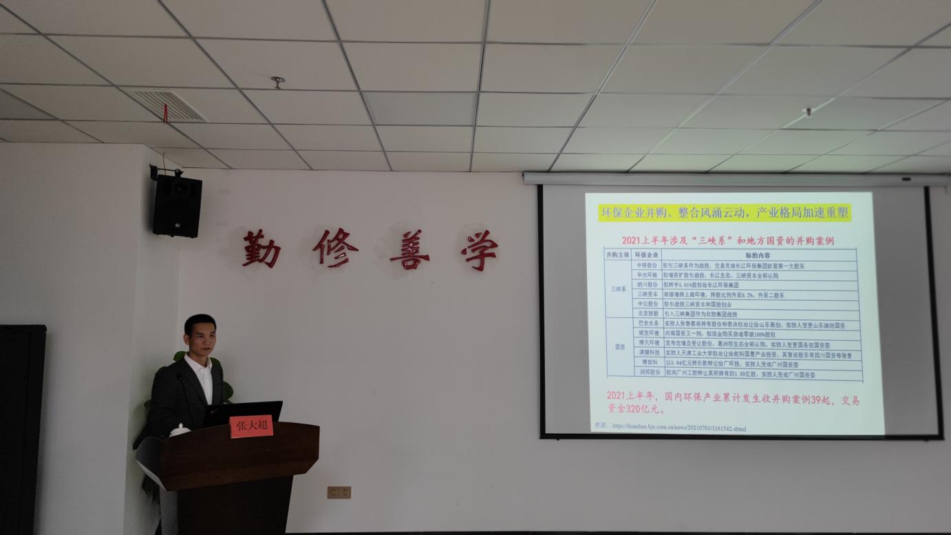 張教授詳細(xì)闡述了目前國內(nèi)環(huán)保產(chǎn)業(yè)發(fā)展態(tài)勢,從環(huán)保產(chǎn)業(yè)方向、集聚區(qū)域、企業(yè)規(guī)模等方面指出了國有企業(yè)在環(huán)保產(chǎn)業(yè)領(lǐng)域的優(yōu)勢與劣勢,為集團(tuán)生態(tài)板塊發(fā)展提出深耕精細(xì)化、系統(tǒng)化運營等建設(shè)性建議。期間,參訓(xùn)人員還與張教授就贛州市域農(nóng)村生活污水處理工藝及市場發(fā)展?fàn)顩r進(jìn)行了深入的探討與交流。