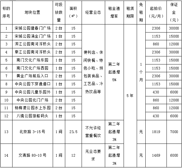 以上清單內(nèi)容僅供參考,以現(xiàn)狀交付,拍賣公司和委托人不承擔(dān)瑕疵擔(dān)保責(zé)任,其中標(biāo)的1-標(biāo)的12僅提供場地,競得人負(fù)責(zé)花車經(jīng)營設(shè)備投資、日常經(jīng)營(包括經(jīng)營秩序、場地保潔、垃圾清運(yùn)、污水廢水處理)。