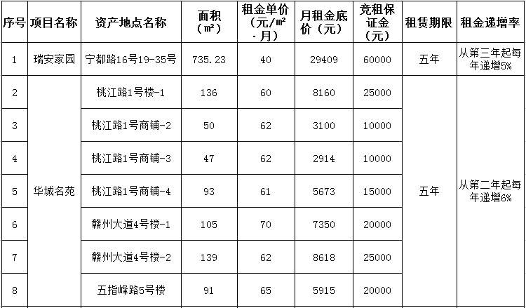 贛州振興實(shí)業(yè)有限責(zé)任公司委托江西潤(rùn)資拍賣(mài)有限公司,定于2020年10月22日10:00開(kāi)始在贛州市公共資源交易中心(長(zhǎng)征大道9號(hào))進(jìn)行國(guó)有資產(chǎn)公開(kāi)招租,現(xiàn)歡迎符合條件的單位或個(gè)人前來(lái)報(bào)名參加競(jìng)租。