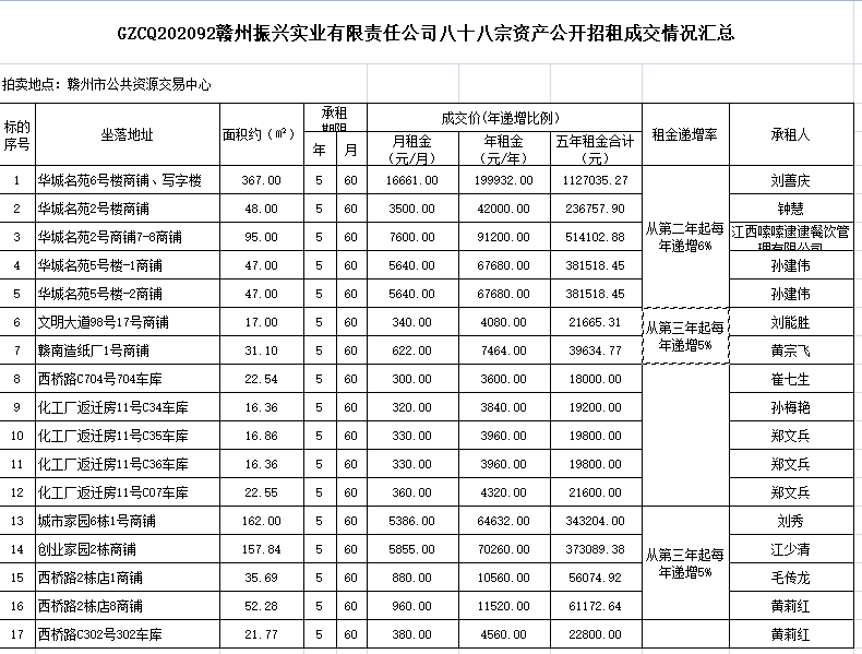 2020年11月25日上午10時(shí),在贛州市公共資源交易中心舉行的贛州振興實(shí)業(yè)有限責(zé)任公司八十八宗資產(chǎn)公開招租(項(xiàng)目編號(hào):GZCQ202092),現(xiàn)將公開招租成交情況公示如下:
