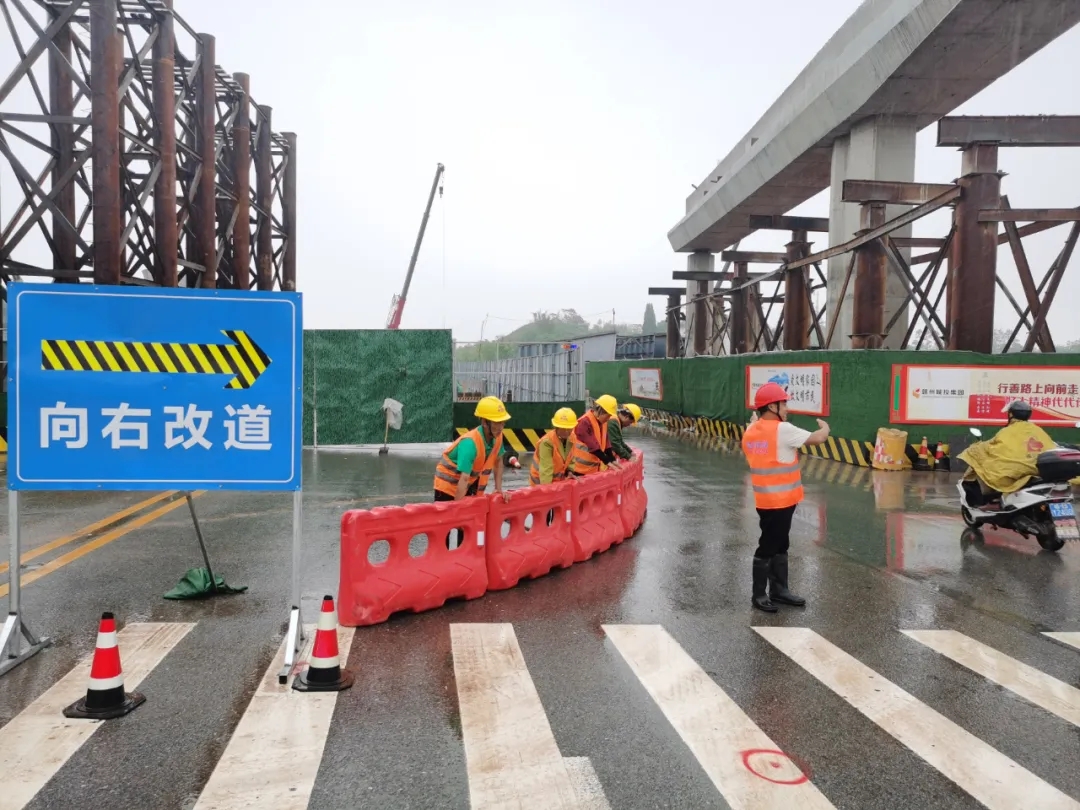 交通安全維護(hù)是項(xiàng)目施工的重中之重。為在確保施工安全和進(jìn)度的前提下,最大限度減少項(xiàng)目建設(shè)對(duì)交通的影響,贛州城投集團(tuán)項(xiàng)目部工作人員迅速行動(dòng),召集施工、監(jiān)理等單位討論編制創(chuàng)業(yè)路橋梁上跨崗邊大道的交通導(dǎo)行方案。為保證交通導(dǎo)行方案的可行性,項(xiàng)目部邀請(qǐng)交警部門、龍泉村村民到現(xiàn)場(chǎng)踏勘,聽取意見、建議,并對(duì)方案進(jìn)一步優(yōu)化、完善。經(jīng)交警部門審批方案通過(guò)后,項(xiàng)目部集中力量抓住4月10日和11日周末兩天的空檔期,加班加點(diǎn)完成了跨崗邊大道區(qū)域的交通導(dǎo)行及圍擋,并在后續(xù)施工中安排了專人對(duì)車輛、行人進(jìn)行引導(dǎo),對(duì)隱患及時(shí)排查整改,派駐安全引導(dǎo)員在學(xué)生上下課時(shí)間點(diǎn)到路口對(duì)通行車輛、行人進(jìn)行引導(dǎo),護(hù)航創(chuàng)業(yè)路三標(biāo)上跨崗邊大道橋梁施工階段的原有地面道路社會(huì)車輛及行人有序通行。