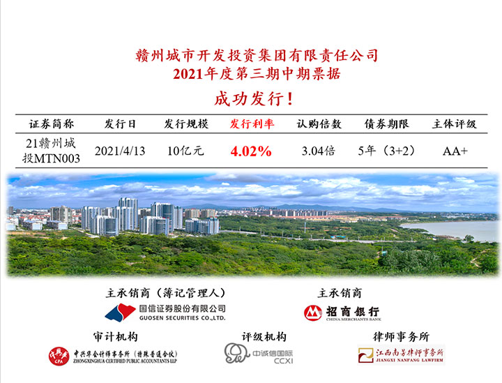 4月13日,贛州城投集團2021年度第三期中期票據(jù)成功發(fā)行,金額10億元,發(fā)行利率4.02%/年,創(chuàng)集團中長期債券品種利率新低,亦創(chuàng)近兩年全省同資質(zhì)同期限10億元以上公司債、企業(yè)債和協(xié)會產(chǎn)品的價格新低。同時該債券是贛州城投集團戰(zhàn)略發(fā)展部黨支部全體黨員黨史學習教育成果與業(yè)務(wù)成果的有力轉(zhuǎn)化。