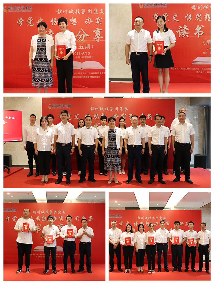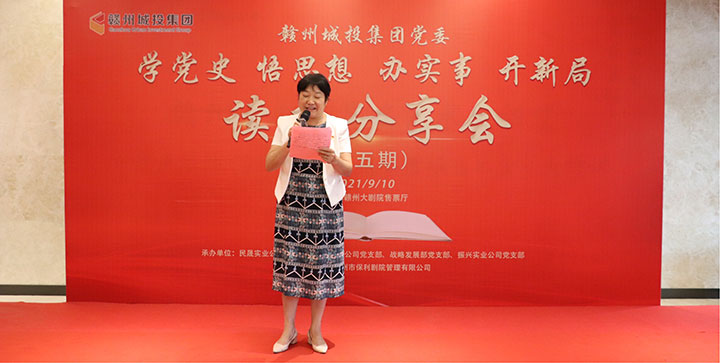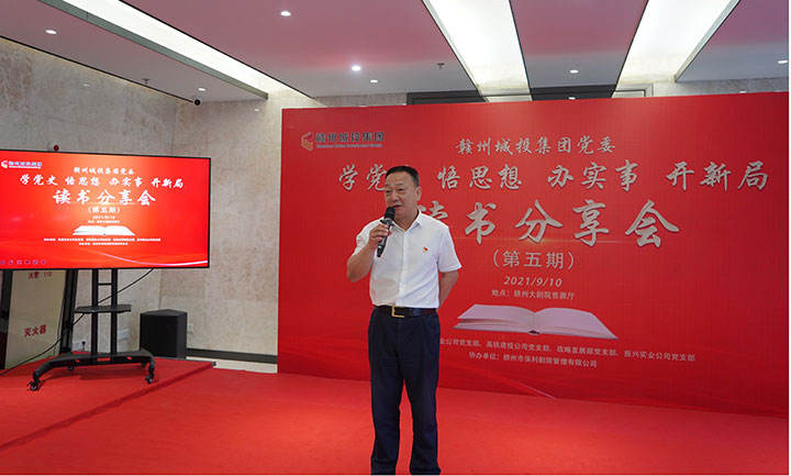 9月10日,為推動黨史學(xué)習(xí)教育有特色、出成效,贛州城投集團黨委在贛州大劇院售票廳舉辦“學(xué)黨史 悟思想 辦實事 開新局”黨史學(xué)習(xí)教育第五期讀書分享會。市國資委二級調(diào)研員宋英蒞臨指導(dǎo),集團黨委副書記黃家偉出席并作點評講話,集團董事會秘書、集團相關(guān)部門負責(zé)人、各黨支部書記及部分黨員參加。